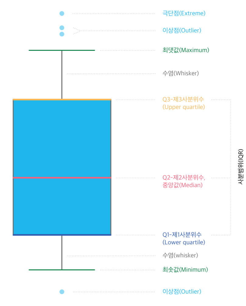 박스플롯: 데이터의 분포를 한 눈에 볼 수 있게 시각화하여 이상치(Outlier)등을 탐지할 수 있는 시각화 도구