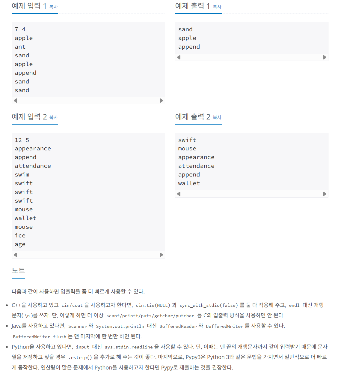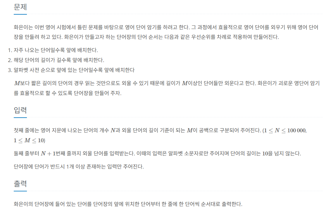 M길이 이상의 단어를 세서 3가지 조건에 맞추어서 정렬한 후 출력하는 문제이다.