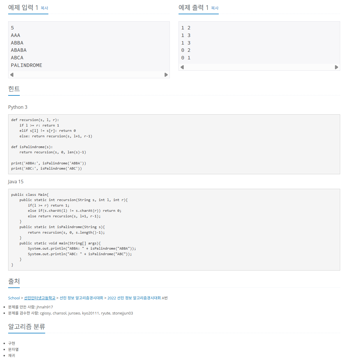 재귀 recursion()함수와 판별 isPalindrome()함수는 가이드가 있다.