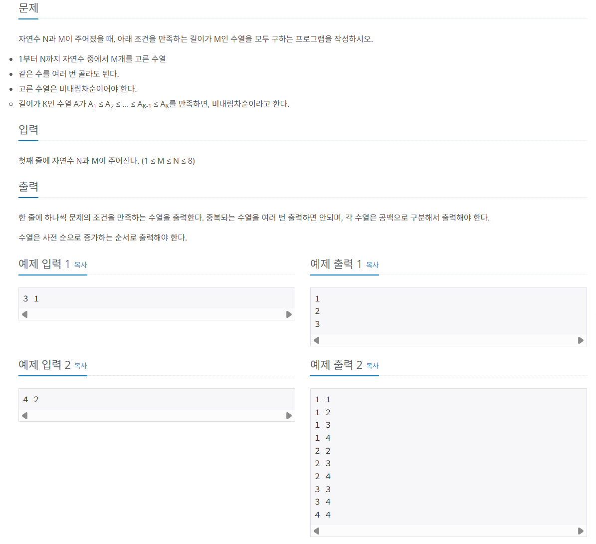 1. 문제 설명https://www.acmicpc.net/problem/156502. 코드import sys input = sys.stdin.readline N,M = map(int,input().split()) path = [] out = [] def dfs(start: int): if len(path) == M: out.append(" ".join(map(str,path))) return for x in range(start,N+