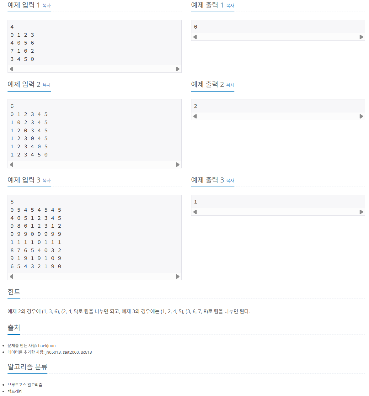selected[i] 배열로 i번 사람이 스타트 팀에 들어갔는지 여부를 관리하면서 DFS(백트리킹)으로 스타트 팀 조합을 만든다.