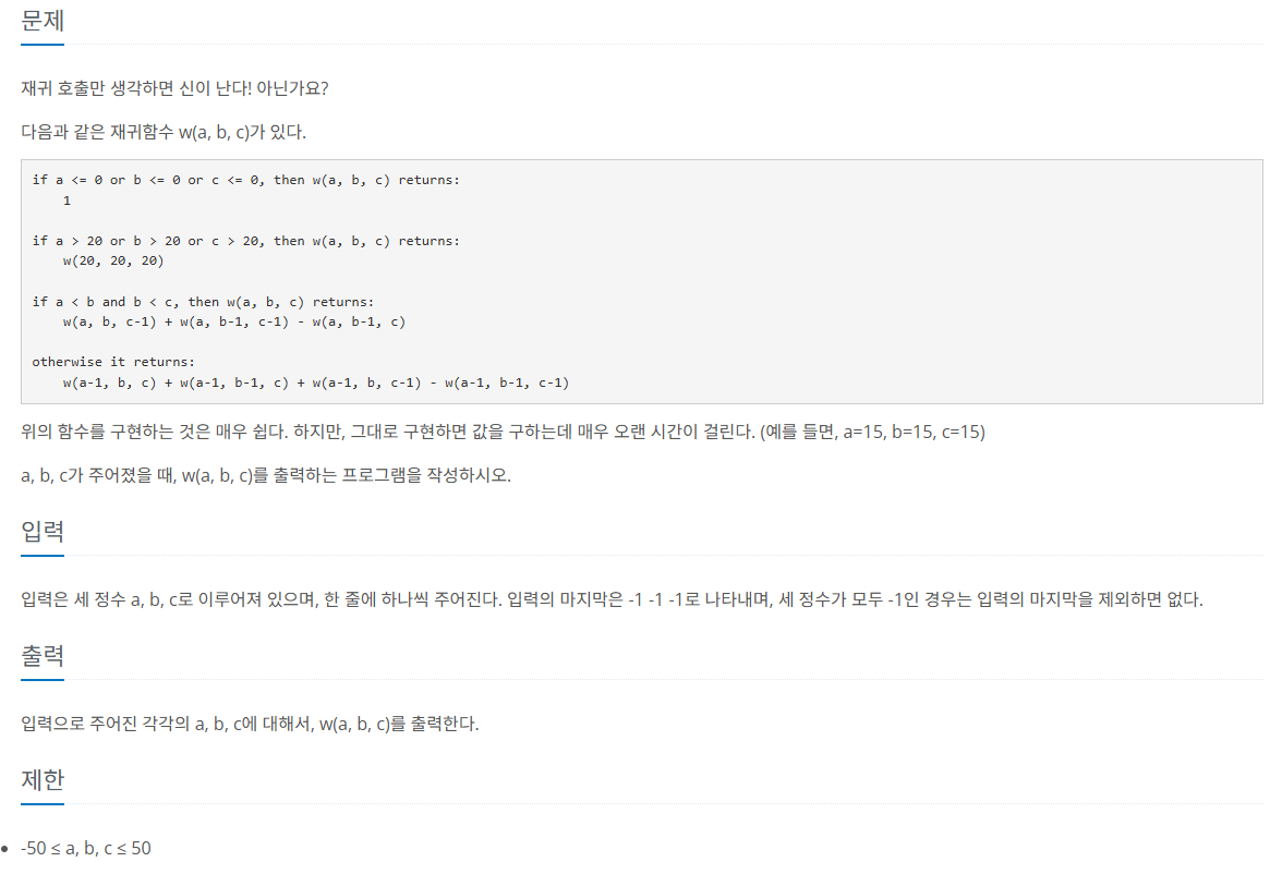 20을 넘어가면 무조건 w(20,20,20)으로 귀결되고 0 이하면 바로 1로 간다.