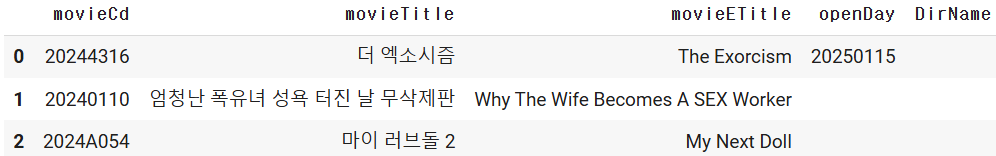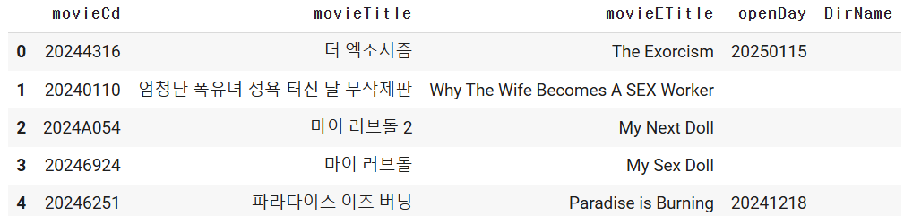 movie_df.at[i, "Genere"] = temp_data["movieInfoResult"]["movieInfo"]["genres"][0]["genreNm"]