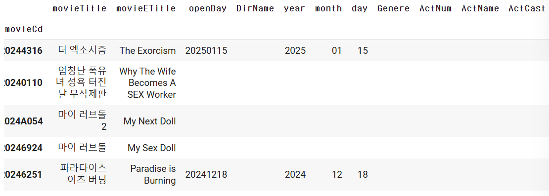 movie_df.at[i, "ActCast"] = temp_data["movieInfoResult"]["movieInfo"]["actors"][0]["cast"]